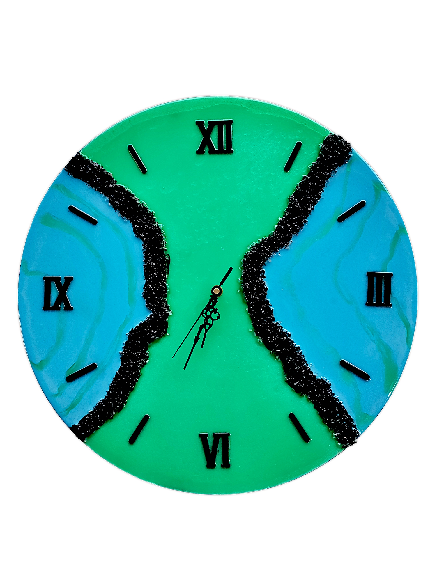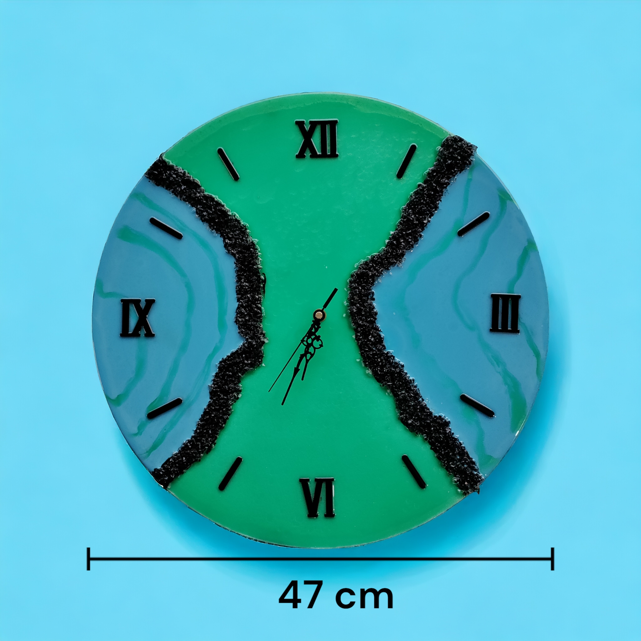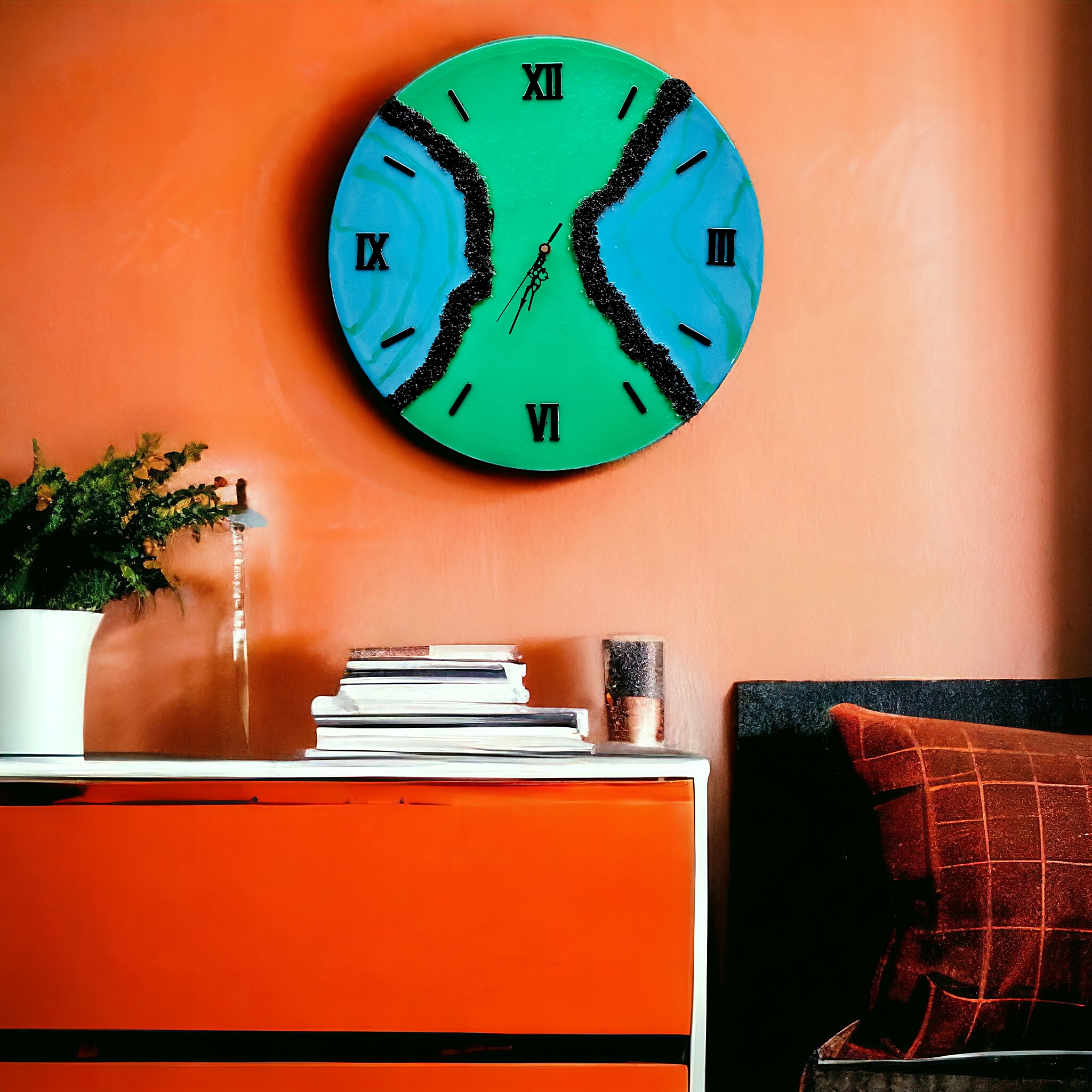 Each resin wall clock is carefully handcrafted using a durable MDF (medium-density fiberboard) base and high-quality epoxy resin. The resin creates a glossy, glass-like finish that enhances the depth and vibrancy of the blue and green hues. With its smooth and polished surface, this clock not only looks elegant but is also long-lasting and easy to maintain. Since each piece is individually handcrafted, no two clocks are identical, making yours a unique and exclusive décor item.