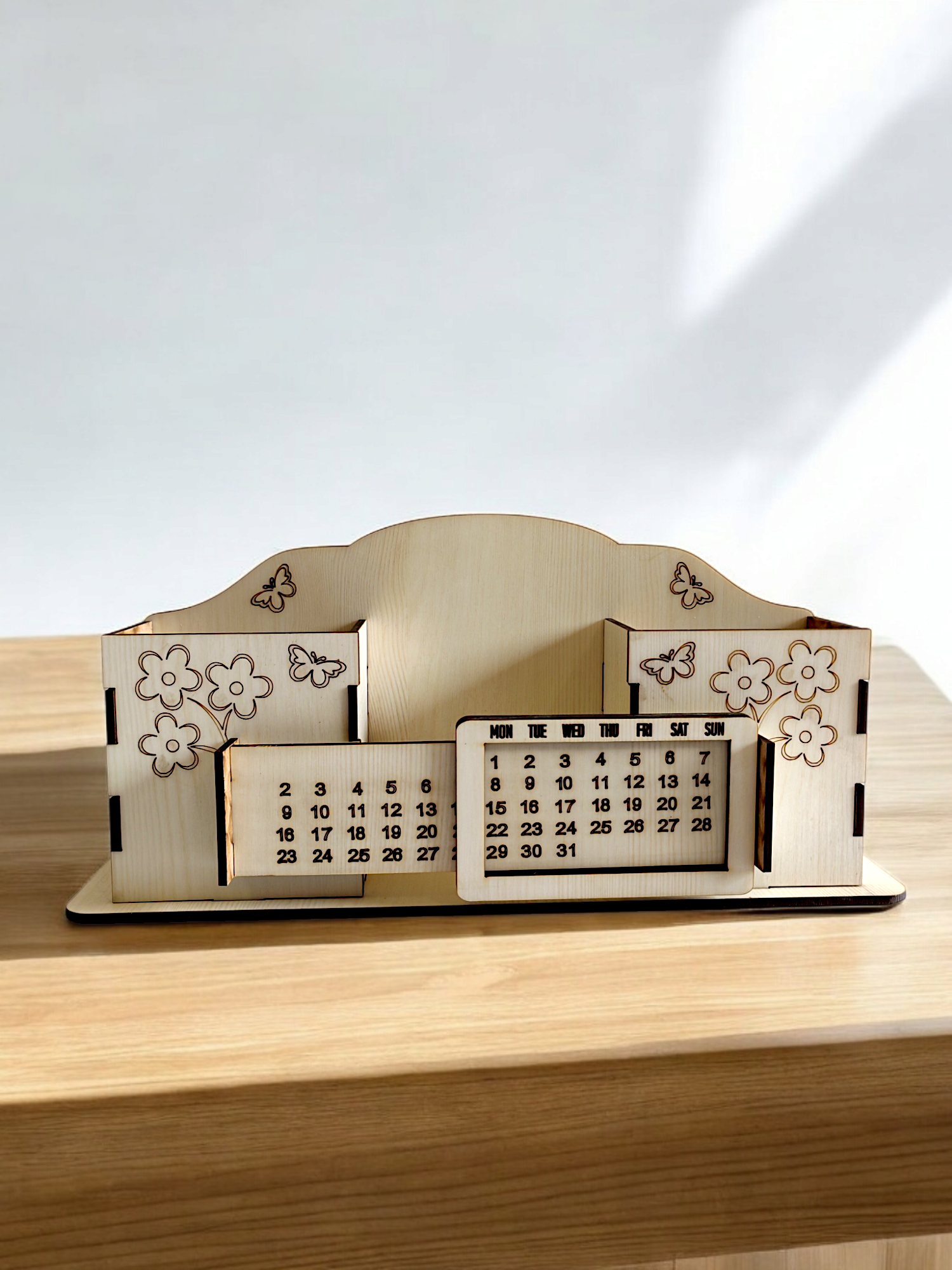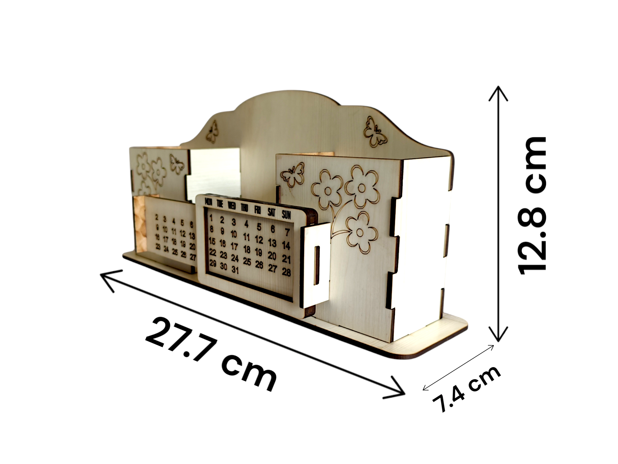 Wooden Desktop Organizer Calander with Pen, Pencil, Sticky Notes Holder Stand | Lifetime Slider Calendar For organizing Home, Office Desk And Study Table